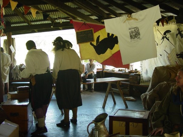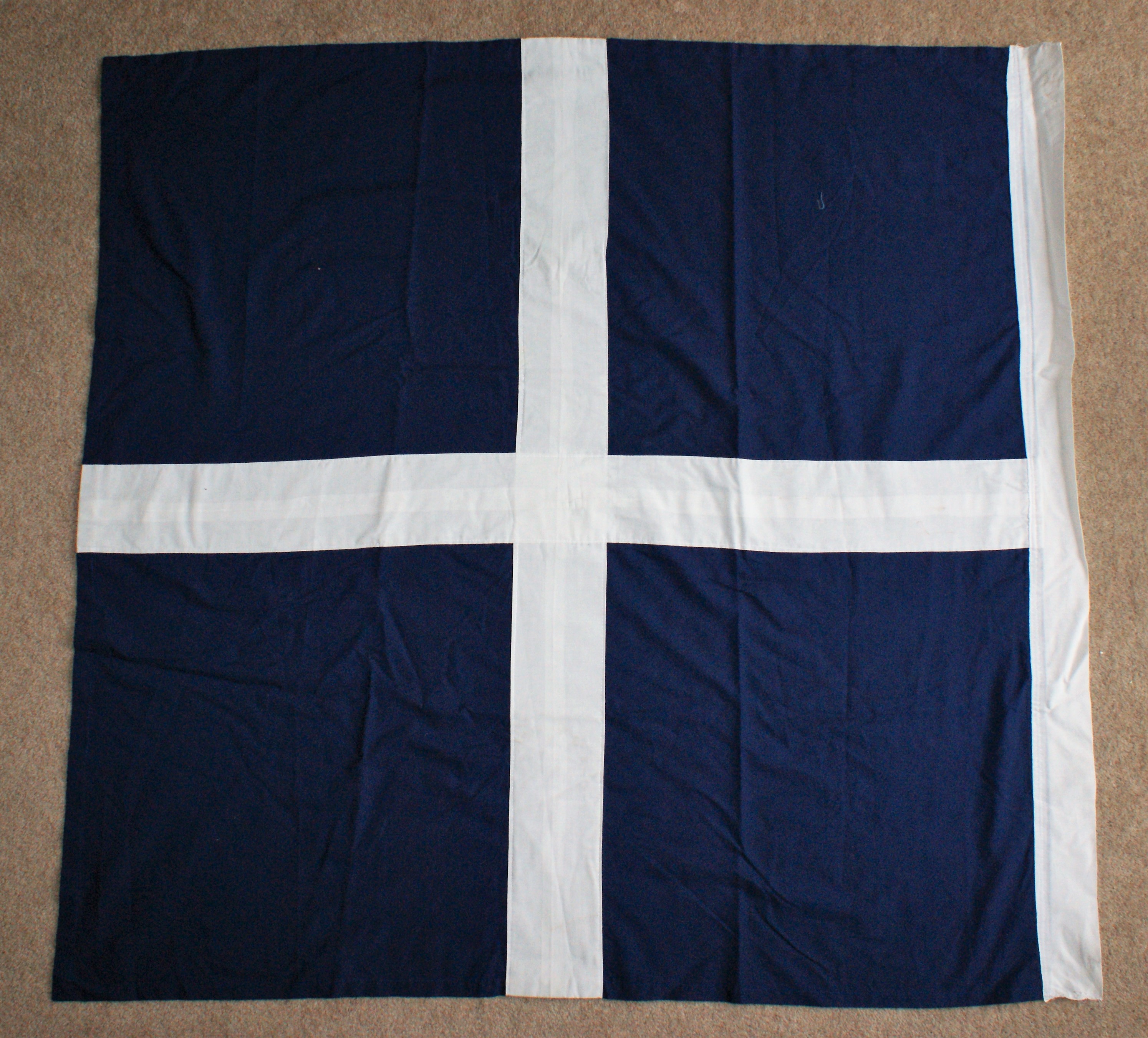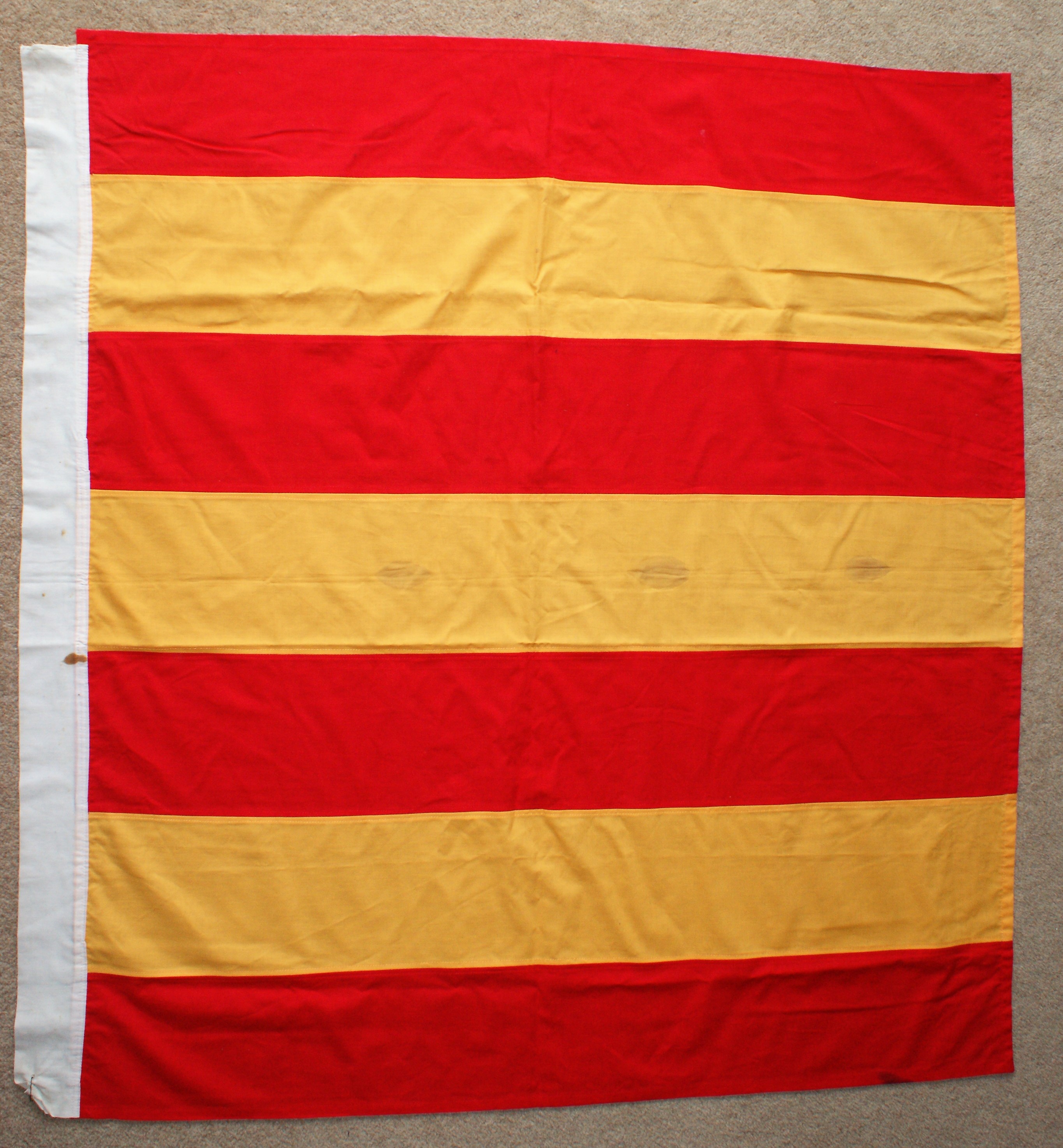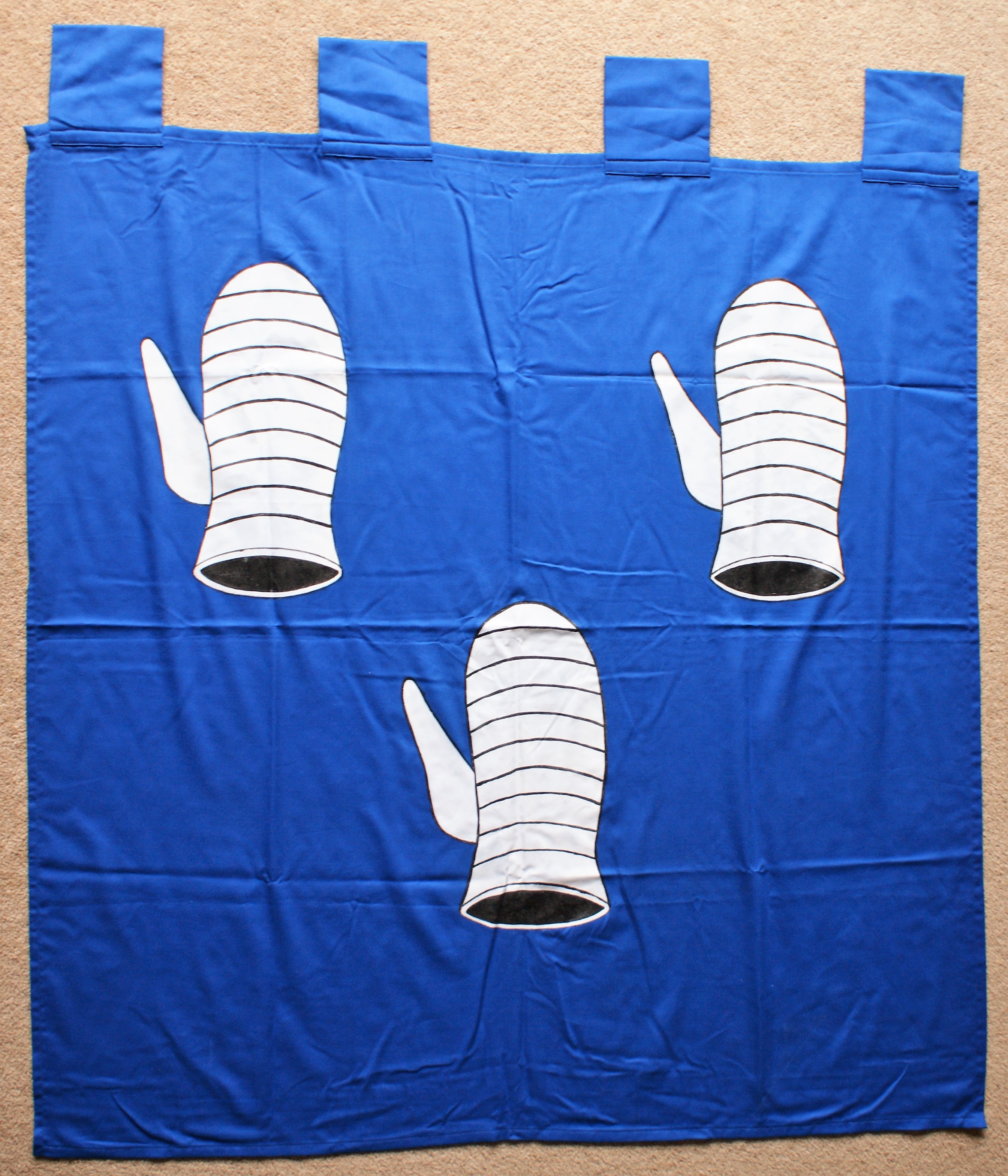 Made for the old 9th Legion in Sydney. Paint on woolen fabric, commercial fringe, tinned brass on leather dangly bits.