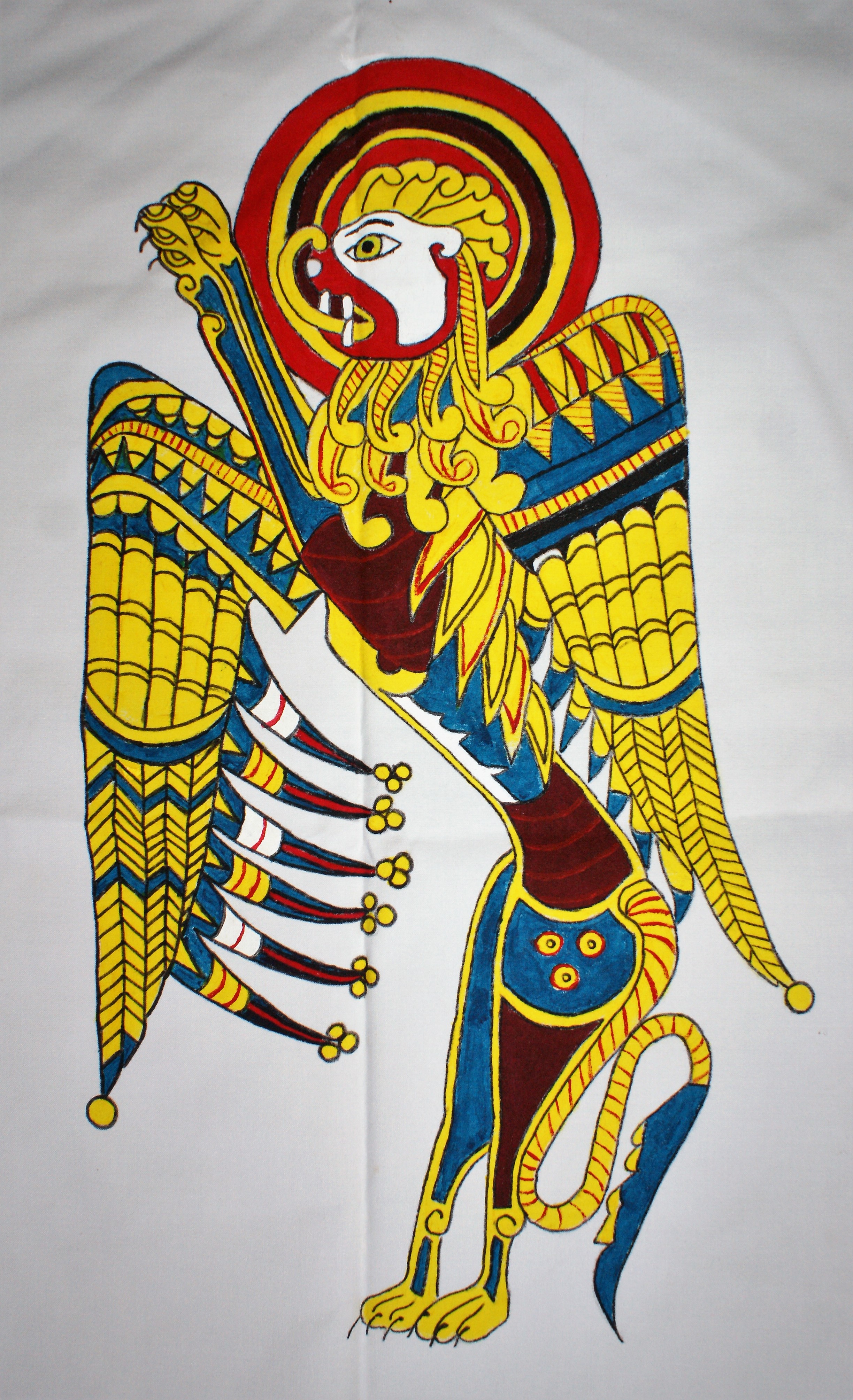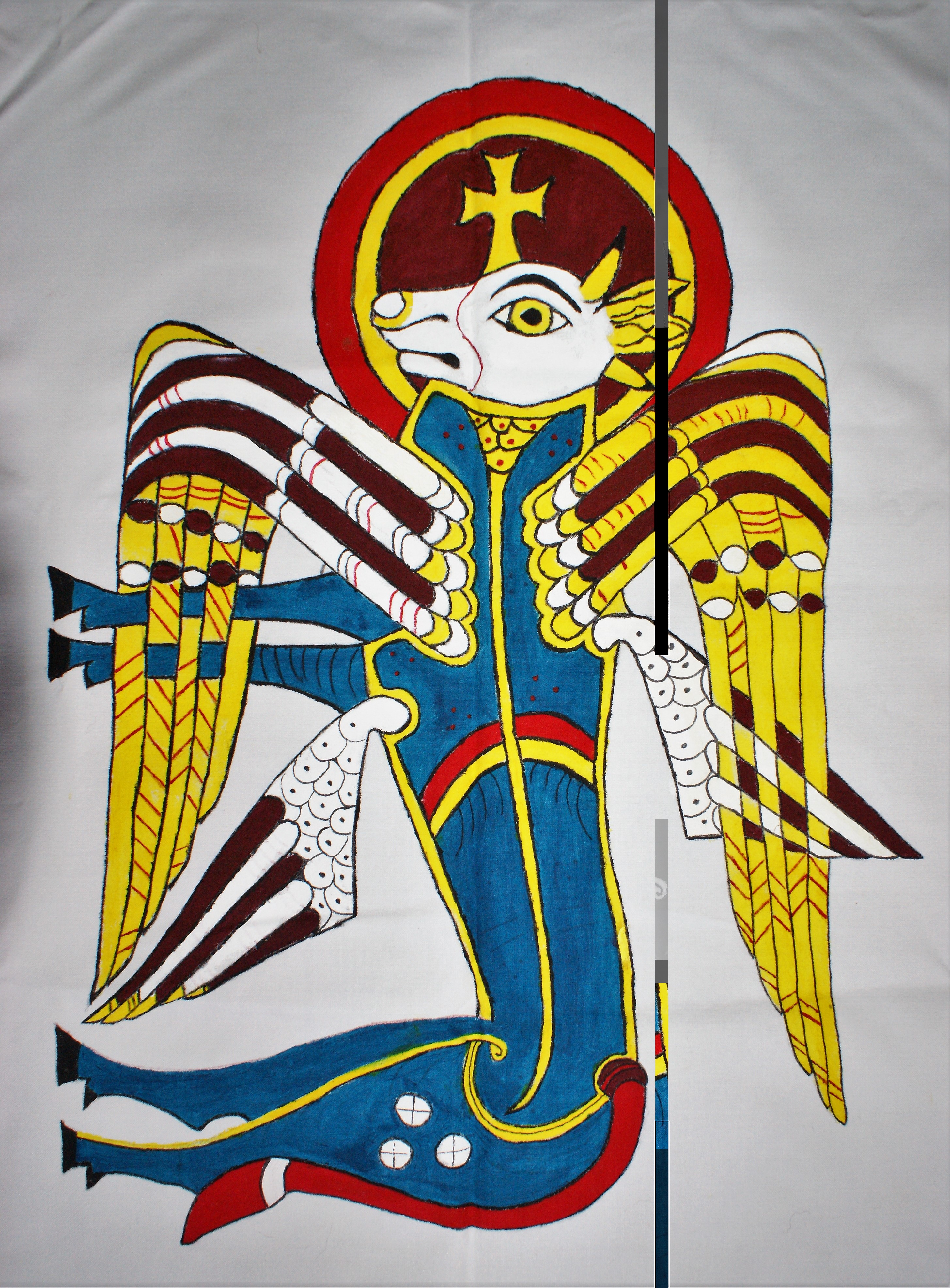Made for the processional Missa Cataractensis, the symbols are for each of the four Evangelists. Mathew was represented by a man with wings, Mark by a lion, Luke by an ox or a calf and John by an eagle. The designs are from the Book of Kells. Paint on silk, leather tabs. Click on the flag for a close-up of the figure.