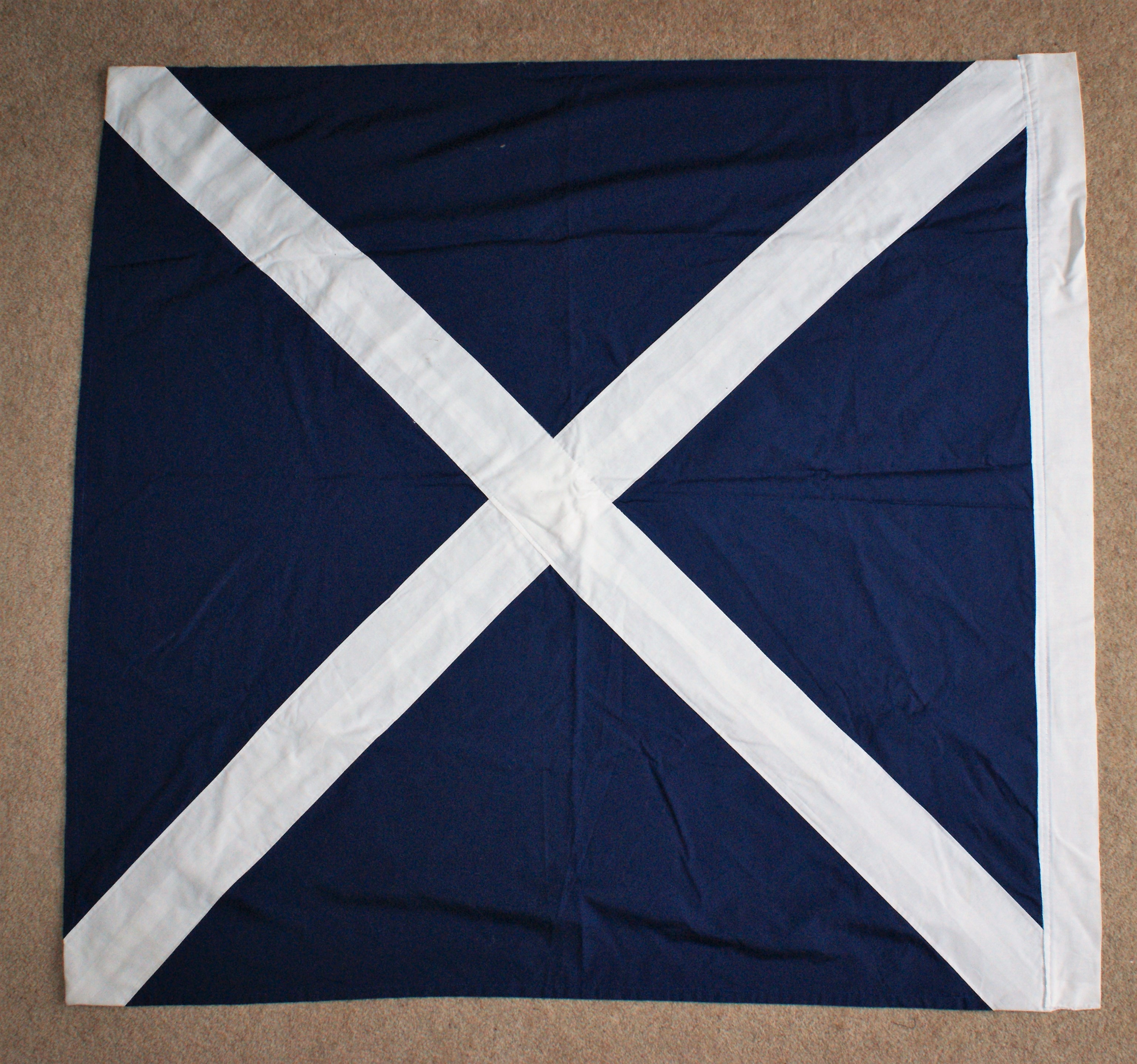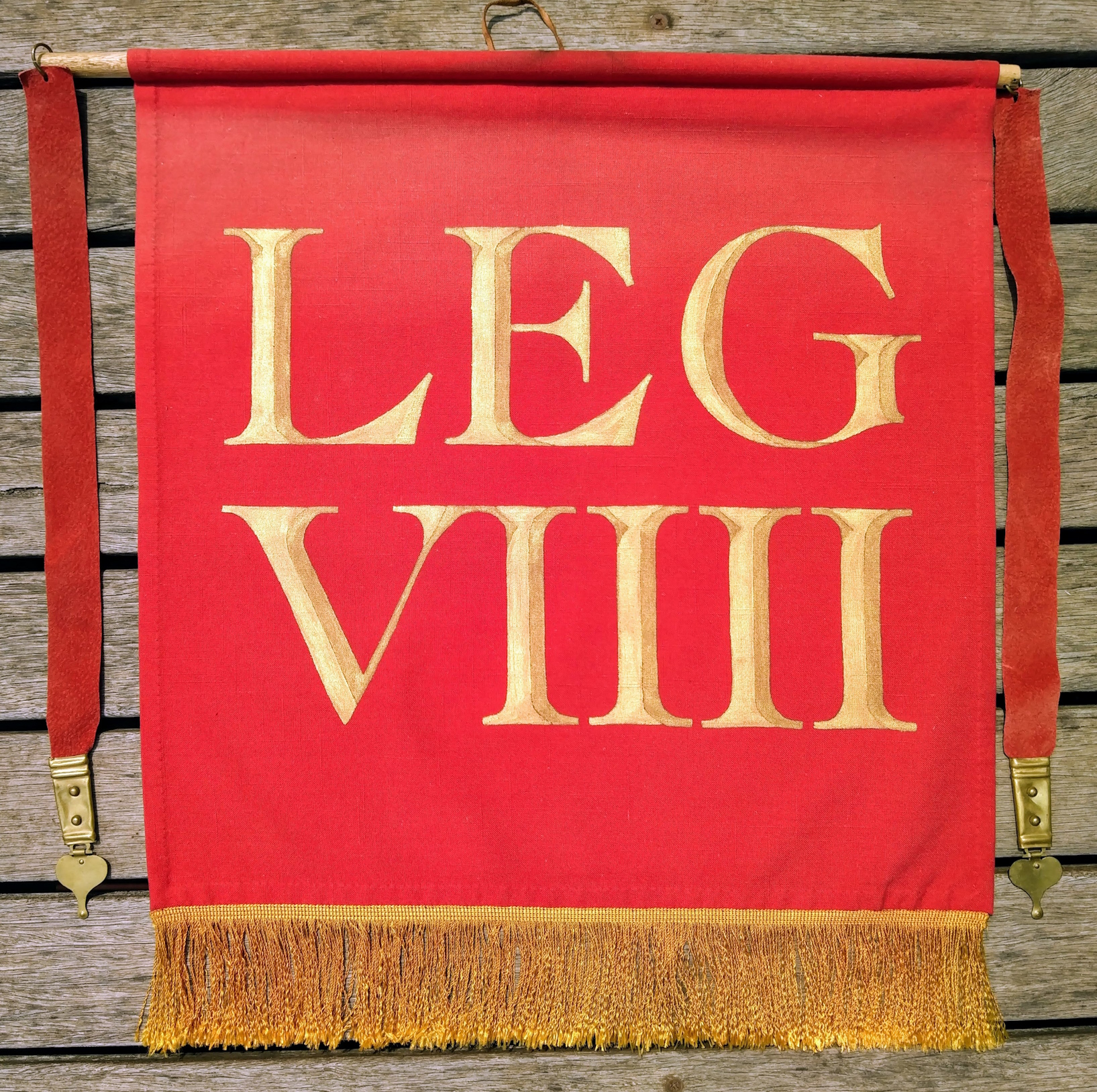 Made for the old 9th Legion in Sydney. Paint on woolen fabric, commercial fringe, tinned brass on leather dangly bits.
