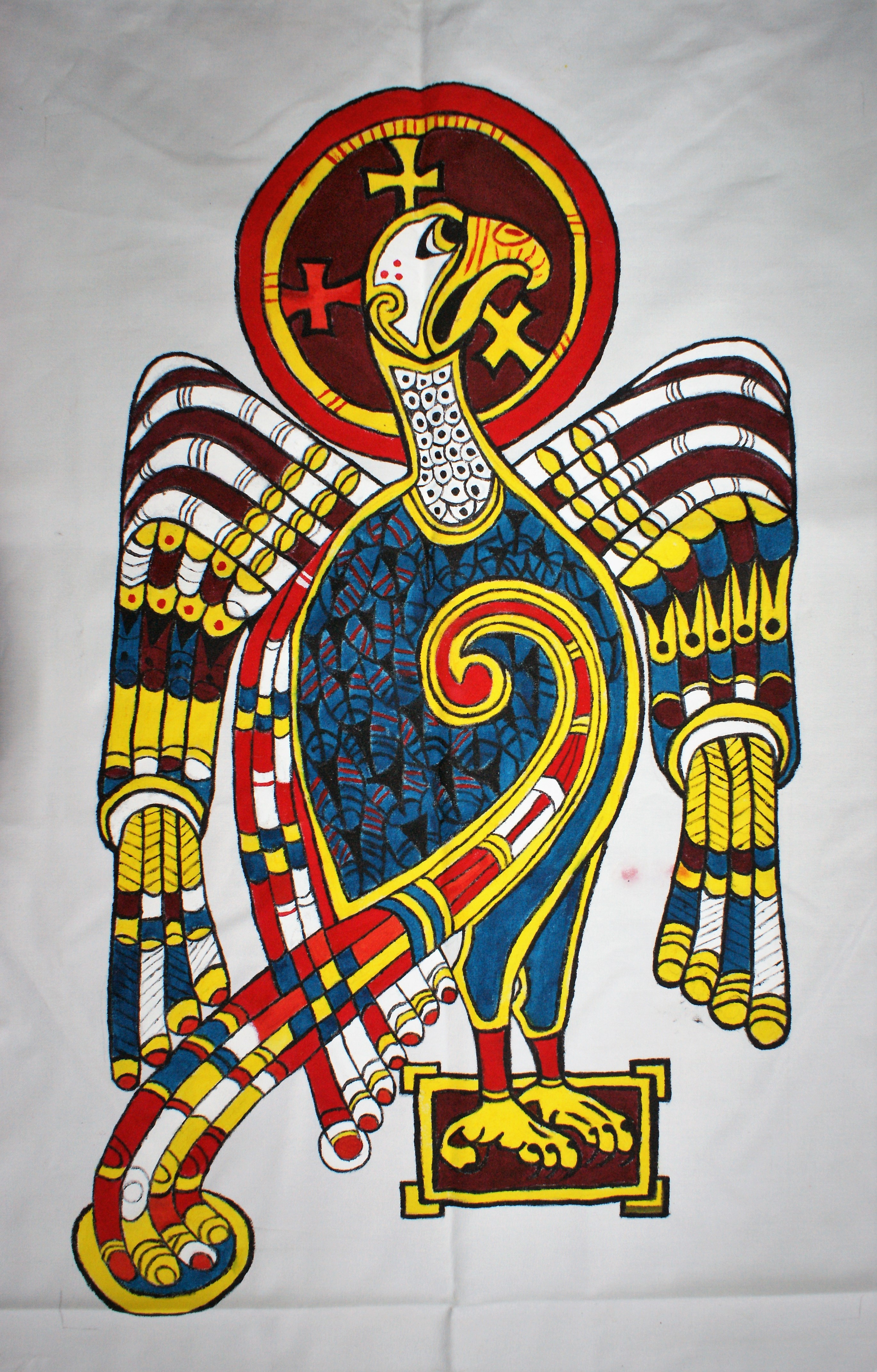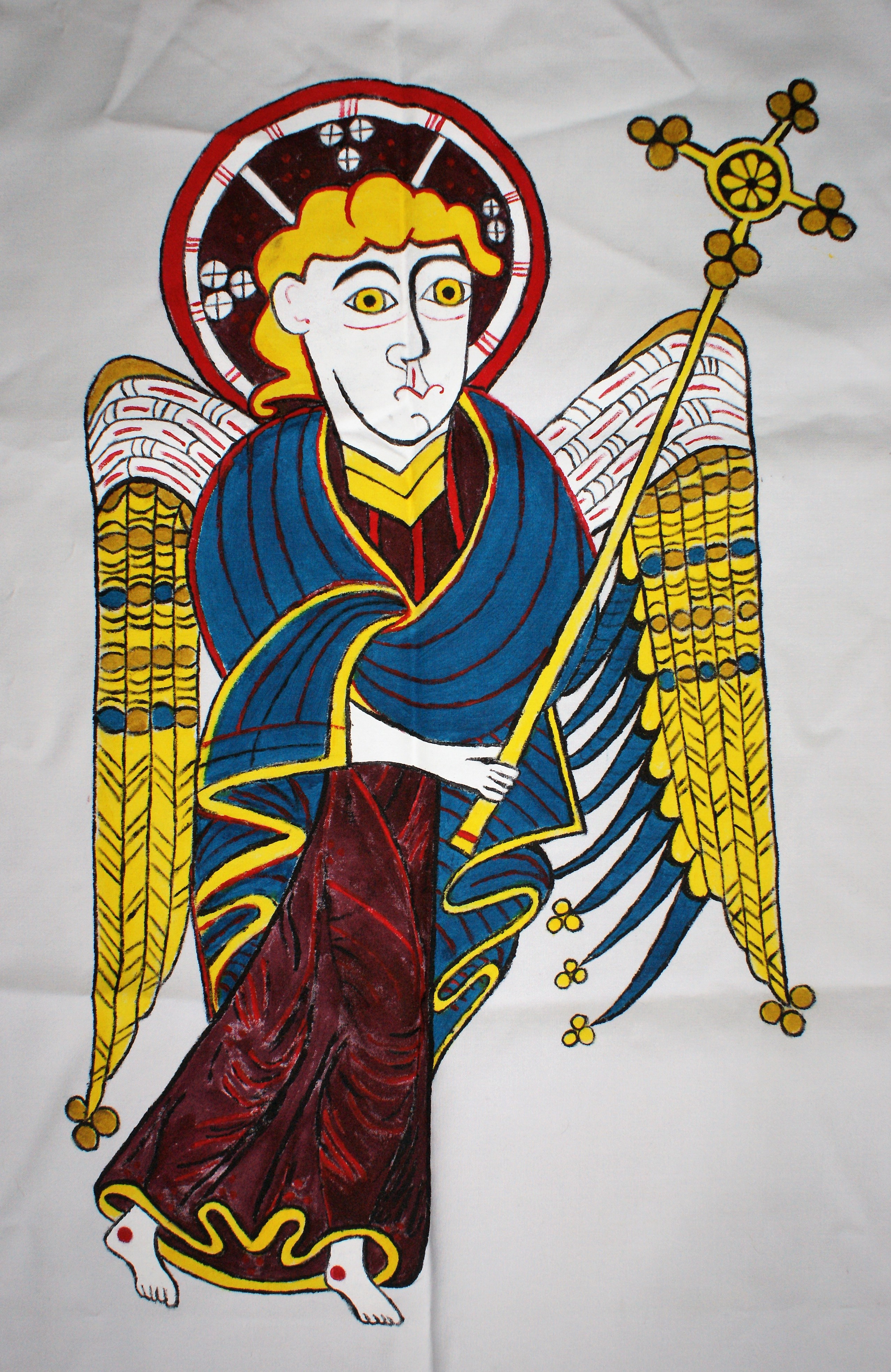Made for the processional Missa Cataractensis, the symbols are for each of the four Evangelists. Mathew was represented by a man with wings, Mark by a lion, Luke by an ox or a calf and John by an eagle. The designs are from the Book of Kells. Paint on silk, leather tabs. Click on the flag for a close-up of the figure.